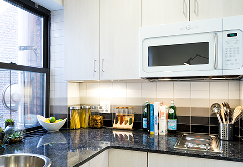 This unit type features a compact corner kitchen with black granite counters, tiled backsplash and window. Built-in maple shelving units offer plenty of storage for media and display. A flip-up table becomes a desk or dining for two. Overhead storage units have plenty of capacity for larger items.